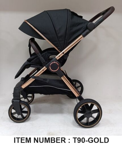 تتميز عربة الأطفال T90-GOLD بتصميم عصري وهيكل معدني باللون الذهبي، مع مقعد قابل للإمالة وسلة سفلية واسعة. تجمع بين الشكل