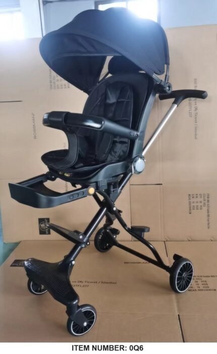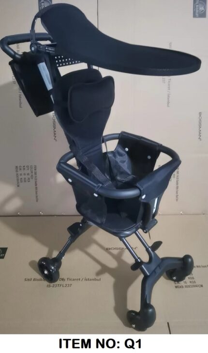 عربة أطفال Q1 عملية بوزن خفيف وتصميم مدمج، مزودة بمقعد مريح، وأحزمة أمان، وغطاء علوي للحماية من الشمس. سهلة الطي