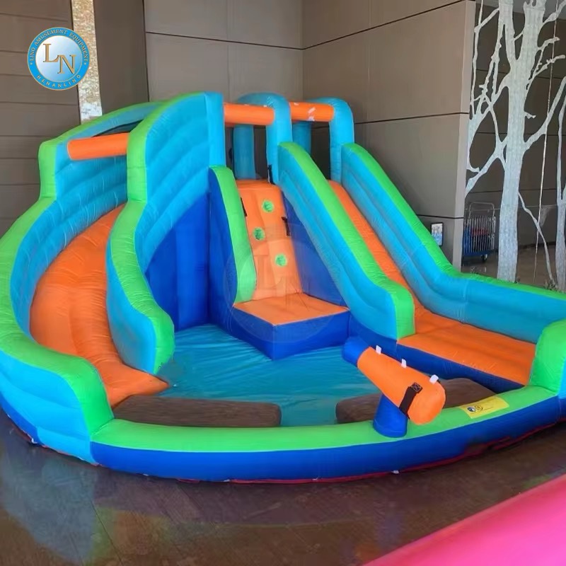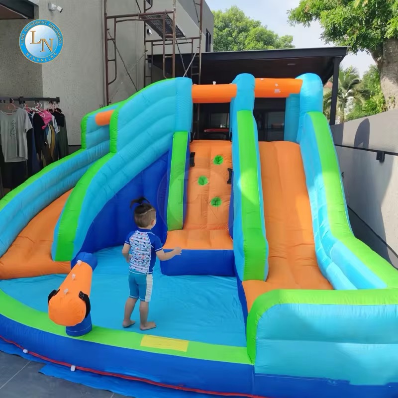نطاطية Doctor Dolphin المائية بتصميم ممتع وألوان زاهية، تحتوي على زحليقتين واسعتين، جدار تسلق مدمج، ومدفع ماء لزيادة المرح!